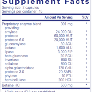 Digestive Enzymes Ultra contains a high-strength mixture of vegetarian enzymes developed to promote optimal nutrient bioavailability and absorption. Digestive Enzymes Ultra supports enhanced protein, carbohydrate, fat, fiber and dairy digestion.*